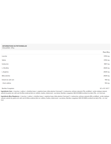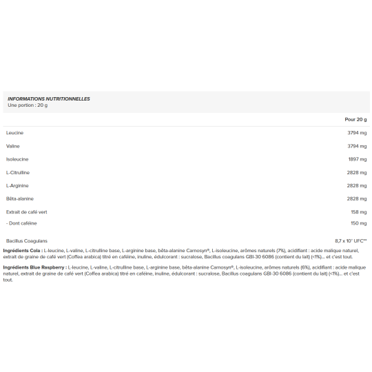 Ingrédients Blue Raspberry : L-leucine, L-valine, L-citrulline base, L-arginine base, bêta-alanine Carnosyn®, L-isoleucine, arômes naturels (6%), acidifiant : acide malique naturel, extrait de graine de café vert (Coffea arabica) titré en caféine, inuline, édulcorant : sucralose, Bacillus coagulans GBI-30 6086 (contient du lait) (<1%)… et c'est tout.