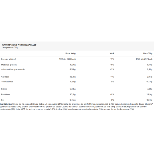 Ingrédients : crème de riz complet (Oryza Sativa L.) en poudre (28%), isolat de protéines de lait (MPI) non instantanéisé (24%), farine de racine de patate douce blanche* (Ipomoea Batatas) (11%), chunks chocolat noir 61%* (masse de cacao*, sucre de canne*, beurre de cacao*) (contient du lait) (11%), blancs d’œufs plein air en poudre pasteurisée (9%), huile MCT de noix de coco en poudre* (8%), inuline (4%), bicarbonate de soude alimentaire (3%), poudre de purée de pomme (2%).