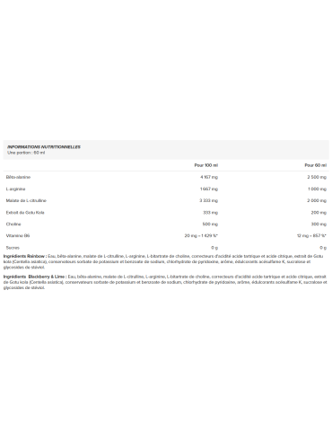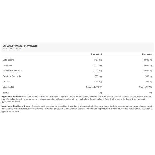 Ingrédients Blackberry & Lime : Eau, bêta-alanine, malate de L-citrulline, L-arginine, L-bitartrate de choline, correcteurs d'acidité acide tartrique et acide citrique, extrait de Gotu kola (Centella asiatica), conservateurs sorbate de potassium et benzoate de sodium, chlorhydrate de pyridoxine, arôme, édulcorants acésulfame K, sucralose et glycosides de stéviol.