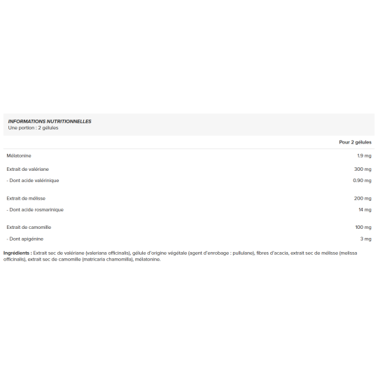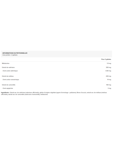 Ingrédients : extrait sec de valériane (valeriana officinalis), gélule d’origine végétale (agent d’enrobage : pullulane), fibres d’acacia, extrait sec de mélisse (melissa officinalis), extrait sec de camomille (matricaria chamomilla), mélatonine.