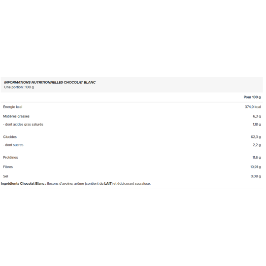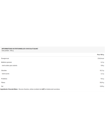 Ingrédients Chocolat Blanc : flocons d'avoine, arôme (contient du LAIT) et édulcorant sucralose.