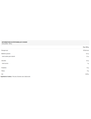 Ingrédients Cookies : Flocons d'avoine avec édulcorant.