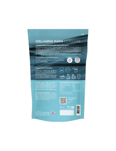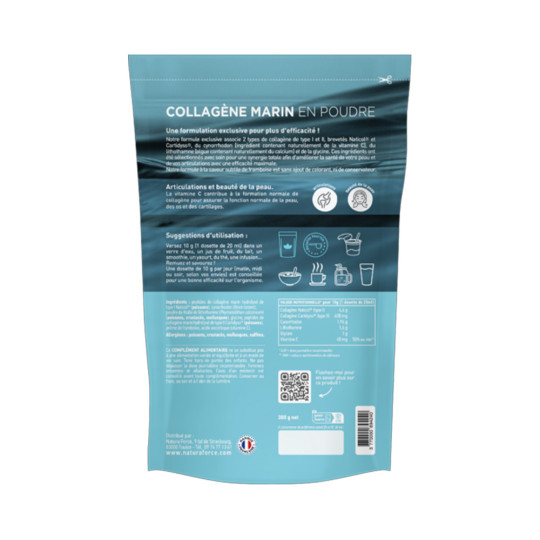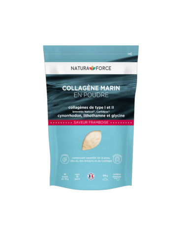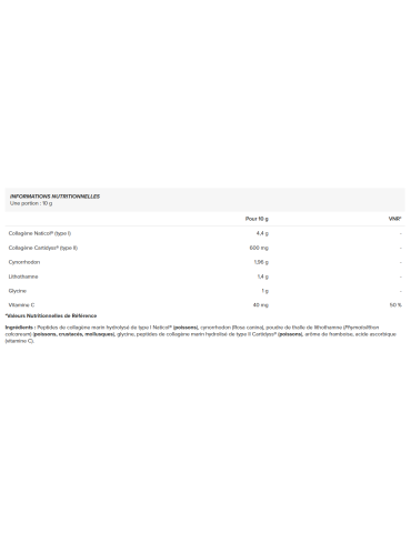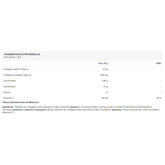 Ingrédients : peptides de collagène marin hydrolysé de type I Naticol® (poissons), cynorrhodon (Rosa canina), poudre de thalle de lithothamne (Phymatolithon calcareum) (poissons, crustacés, mollusques), glycine, peptides de collagène marin hydrolisé de type II Cartidyss® (poissons), arôme de framboise, acide ascorbique (vitamine C).