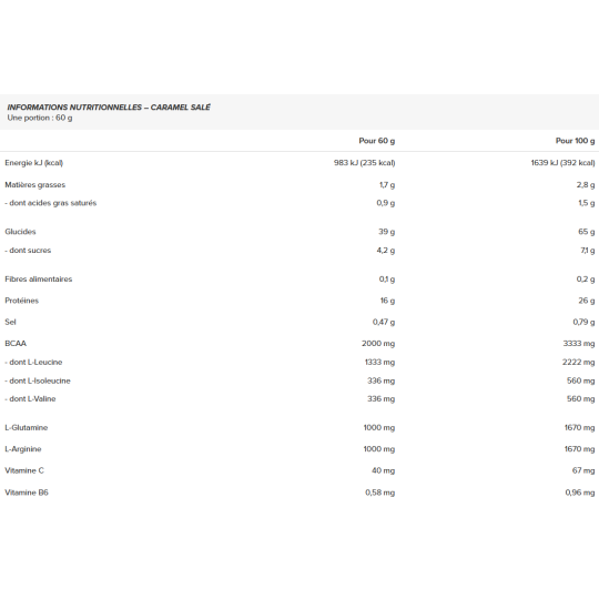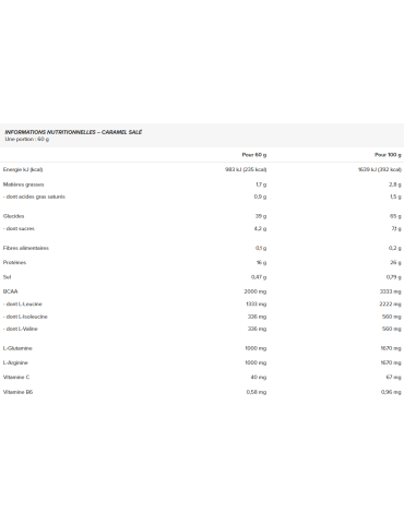 Ingrédients (Caramel Salé) : maltodextrine, concentré de protéine de lactosérum (lait) (émulsifiant : lécithine de soja), poudre d’acides aminés à chaîne ramifiée instantanée (BCAA) 2:1:1, hydrolysat de protéine de lactosérum (lait), isolat de protéine de lactosérum (lait), lécithine de soja, arôme, L-glutamine, base de L-arginine, L-leucine, lécithine de tournesol en poudre, bêta-cyclodextrine, sel, épaississant (gomme xanthane), poudre de caramel, édulcorants (sucralose, glycosides de stéviol), vitamine C (acide ascorbique), vitamine B6 (chlorhydrate de pyridoxine).