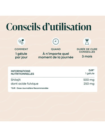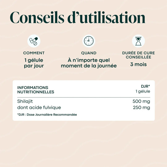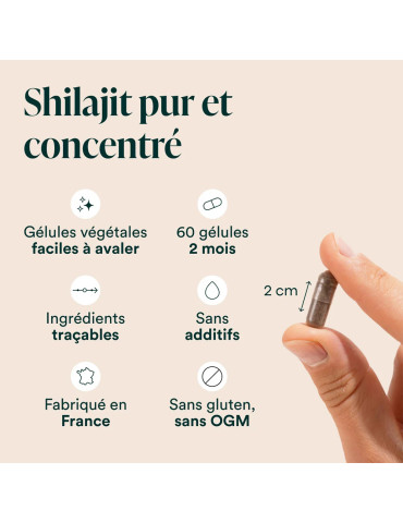 Ingrédients : Shilajit (Asphaltum bitumens), capsule d’origine végétale (agent d’enrobage : hydroxypropylméthylcellulose), amidon de riz, farine de noix de coco.