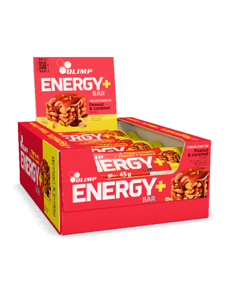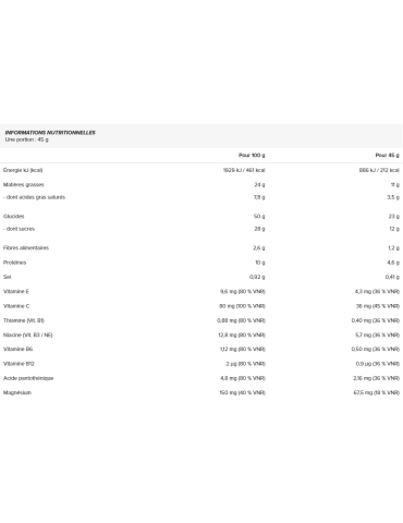 Ingrédients: arachides 25,5%, chocolat au lait 25% [sucre, beurre de cacao, poudre de lait entier, pâte de cacao, émulsifiant: lécithines (de soja); arôme naturel vanille], sirop de glucose, flocons de céréales extrudés [farine de riz, farine de blé, sel, farine de maïs, sucre, malt d'orge cristallisé], lait concentré, maltodextrine, sirop de sucre inverti, huile végétale (tournesol), humectant: glycérol; émulsifiant: lécithines (de soja); sel, arôme, acétate de DL-alpha-tocophéryle - vit. E, acide L ascorbique - vit. C, chlorhydrate de pyridoxine - vit. B6, chlorhydrate de thiamine - thiamine (vit. B1), nicotinamide - niacine, cyanocobalamine - vit. B12, D-pantothénate de calcium - acide pantothénique, oxyde de magnésium - magnésium, extrait de guarana 0,1% [caféine]. Chocolat au lait - cacao: 35% minimum, solides du lait: 21% minimum.