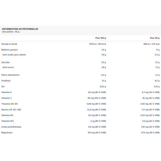 | Énergie kJ (kcal) | 1929 kJ / 461 kcal | 886 kJ / 212 kcal |