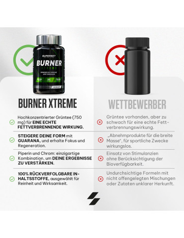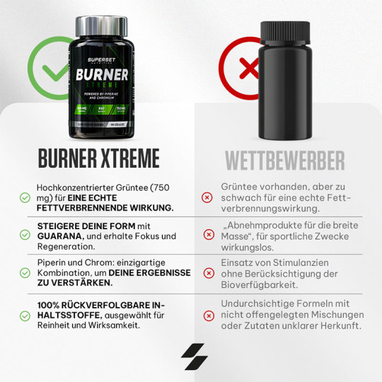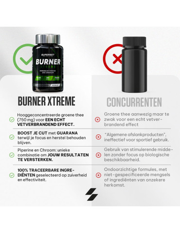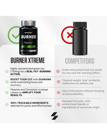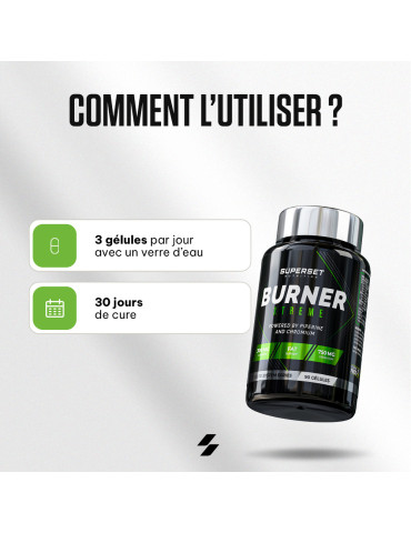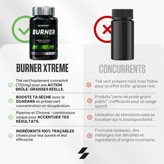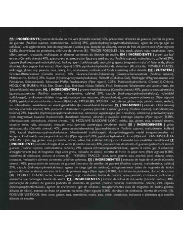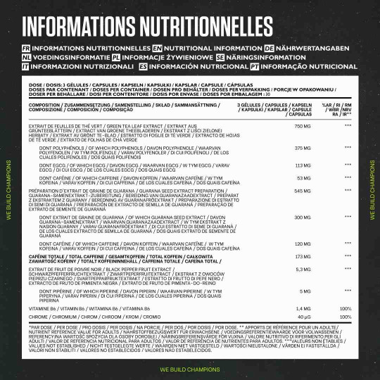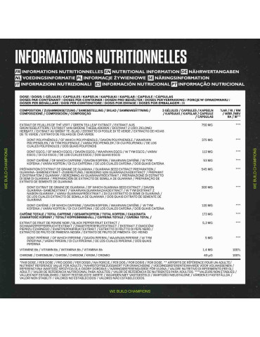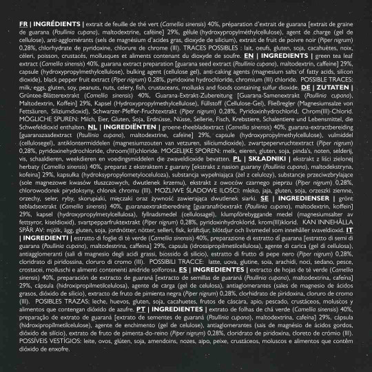 Ingrédients : extrait de feuille de thé vert (Camellia sinensis) 40%, préparation d’extrait de guarana [extrait de graine de guarana (Paullinia cupana), maltodextrine, caféine] 29%, gélule (hydroxypropylméthylcellulose), agent de charge (gel de cellulose), anti-agglomérants (sels de magnésium d’acides gras, dioxyde de silicium), extrait de fruit de poivre noir (Piper nigrum) 0,28%, chlorhydrate de pyridoxine, chlorure de chrome (III).