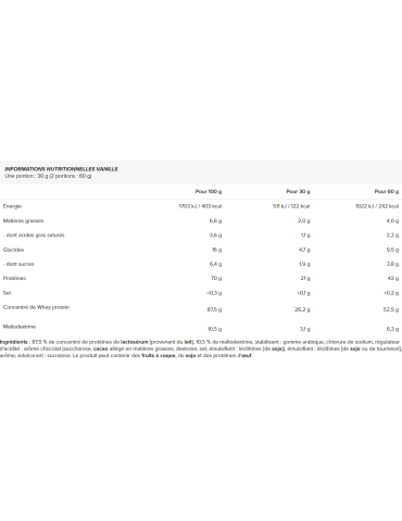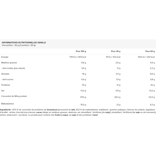 Ingrédients : 87,5 % de concentré de protéines de lactosérum [provenant du lait], 10,5 % de maltodextrine, stabilisant : gomme arabique, chlorure de sodium, régulateur d'acidité : arôme chocolat (saccharose, cacao allégé en matières grasses, dextrose, sel, émulsifiant : lécithines [de soja]), émulsifiant : lécithines [de soja ou de tournesol], arôme, édulcorant : sucralose. Le produit peut contenir des fruits à coque, du soja et des protéines d'œuf.