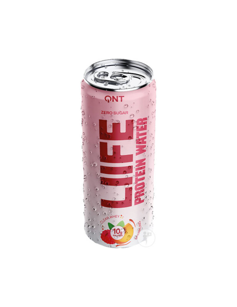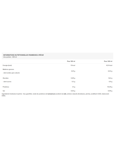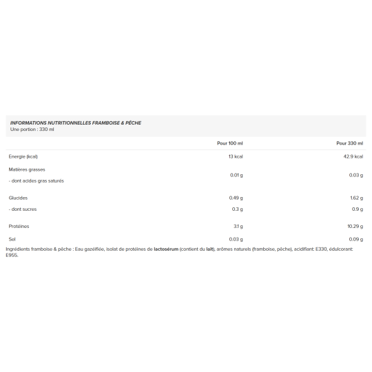 Ingrédients - saveur framboise & pêche : eau gazéifiée, isolat de protéines de lactosérum (contient du lait), arômes naturels (framboise, pêche), acidifiant: E330, édulcorant: E955.