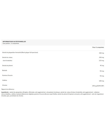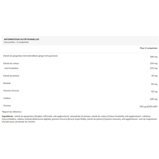 Ingrédients : extrait de gingembre (Zingiber officinale), anti-agglomérnat : phosphate tricalcique, extrait de coleus (Coleus forskohlii), anti-agglomérant : cellulose microcristalline, caféine, baobab (Adansonia digitata), gomme d'acacia (Acacia seyal Delile), extrait de piment (Capsium annuum), anti-agglomérant : sels de magnésium d'acides gras, picolinate de chrome.