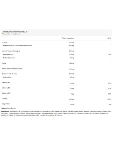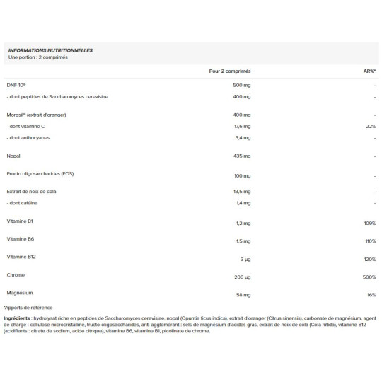 Ingrédients : hydrolysat riche en peptides de Saccharomyces cerevisiae, nopal (Opuntia ficus indica), extrait d'oranger (Citrus sinensis), carbonate de magnésium, agent de charge : cellulose microcristalline, fructo-oligosaccharides, anti-agglomérant : sels de magnésium d'acides gras, extrait de noix de cola (Cola nitida), vitamine B12 (acidifiants : citrate de sodium, acide citrique), vitamine B6, vitamine B1, picolinate de chrome.