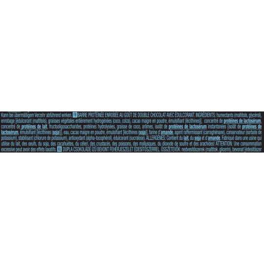 Ingrédients double chocolat : humectants (maltitols, glycérol), enrobage [édulcorant (maltitols), graisses végétales entièrement hydrogénées (coco, colza), poudre de cacao dégraissée, émulsifiant (lécithines)], concentré de protéines de lactosérum, concentré de protéines de lait, fructo-oligosaccharides, protéines hydrolysées, graisse de coco, arômes, isolat de protéines de lactosérum instantané {isolat de protéines de lactosérum, émulsifiant [lécithines (soja)]}, eau, poudre de cacao dégraissée, émulsifiant [lécithines (soja)], farine d'amandes, agent raffermissant (carraghénane), conservateur (sorbate de potassium), stabilisateur (chlorure de potassium), antioxydant (alpha-tocophérol), édulcorant (sucralose).
