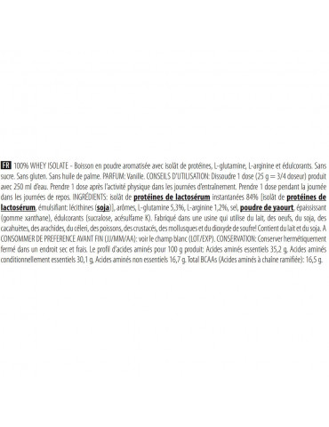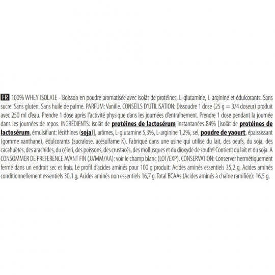 Ingrédients Vanille : Isolat de protéines de lactosérum instantané 84% [Isolat de protéines de lactosérum, émulsifiant : lécithines (soja)], arômes, L-glutamine 5,3%, L-arginine 1,2%, sel, poudre de yaourt, épaississant (gomme xanthane), édulcorants (sucralose, acésulfame K).