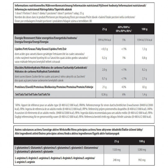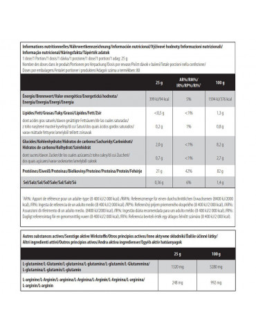 Ingrédients Banane : Isolat de protéines de lactosérum instantané 84% [Isolat de protéines de lactosérum, émulsifiant : lécithines (soja)], arômes, L-glutamine 5.3%, poudre de yaourt, L-arginine 1.2%, sel, épaississant (gomme xanthane), acidifiant (acide malique), édulcorants (sucralose, acésulfame K).