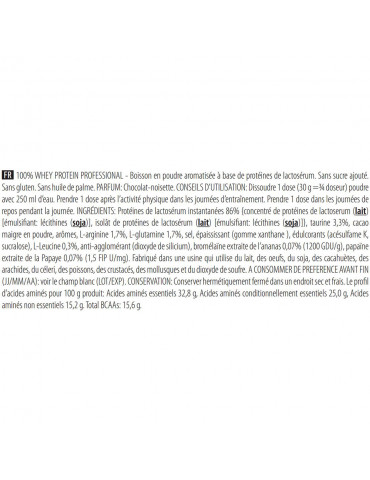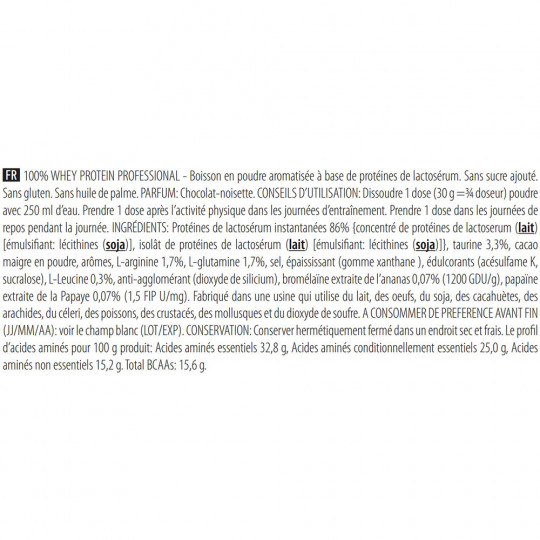 Chocolat noisette : Protéines de lactosérum instantanées 86% {concentré de protéines de lactosérum (lait) [émulsifiant: lécithines (soja)], isolât de protéines de lactosérum (lait) [émulsifiant: lécithines (soja)]}, taurine 3,3%, cacao maigre en poudre, arômes, L-arginine 1,7%, L-glutamine 1,7%, sel, épaississant (gomme xanthane ), édulcorants (acésulfame K, sucralose), L-Leucine 0,3%, anti-agglomérant (dioxyde de silicium), bromélaïne extraite de l’ananas 0,07% (1200 GDU/g), papaïne extraite de la Papaye 0,07% (1,5 FIP U/mg).