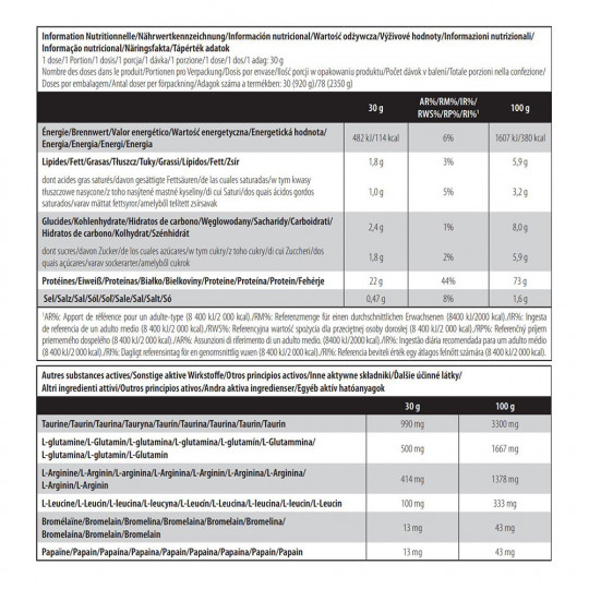 Vanille Fruits rouges : Protéines de lactosérum instantanées 87% {concentré de protéines de lactosérum (lait) [émulsifiant: lécithines (soja)], isolât de protéines de lactosérum (lait) [émulsifiant: lécithines (soja)]}, arômes, taurine 3,3%, L-arginine 1,7%, L-glutamine 1,7%, sel, épaississant (gomme xanthane), L-Leucine 0,3%, édulcorants (acésulfame K, sucralose), anti-agglomérant (dioxyde de silicium), bromélaïne extraite de l’ananas 0,07% (1200 GDU/g), papaïne extraite de la Papaye 0,07% (1,5 FIP U/mg), colorants (cramoisi*, Bleu brillant FCF).* Cramoisi: peut avoir des effets indésirables sur l’activité et l’attention chez les enfants.