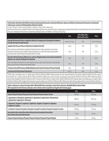 Chocolat : Protéines de lactosérum instantanées 85% {concentré de protéines de lactosérum (lait) [émulsifiant: lécithines (soja)], isolât de protéines de lactosérum (lait) [émulsifiant: lécithines (soja)]}, taurine 3,3%, cacao maigre en poudre, arômes, L-arginine 1,7%, L-glutamine 1,7%, sel, épaississant (gomme xanthane), L-Leucine 0,3%, édulcorants (acésulfame K, sucralose), anti-agglomérant (dioxyde de silicium), bromélaïne extraite de l’ananas 0,07% (1200 GDU/g), papaïne extraite de la Papaye 0,07% (1,5 FIP U/mg).