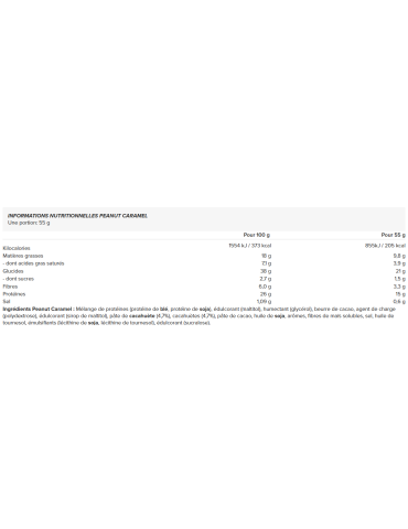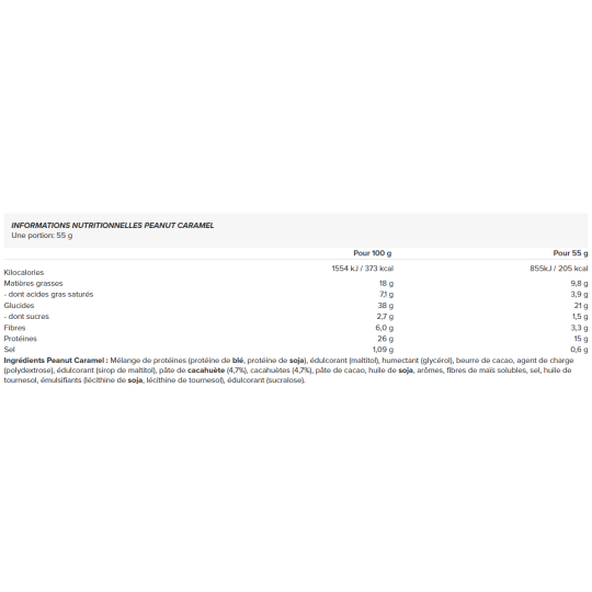 Ingrédients Peanut Caramel : Mélange de protéines (protéine de blé, protéine de soja), édulcorant (maltitol), humectant (glycérol), beurre de cacao, agent de charge (polydextrose), édulcorant (sirop de maltitol), pâte de cacahuète (4,7%), cacahuètes (4,7%), pâte de cacao, huile de soja, arômes, fibres de maïs solubles, sel, huile de tournesol, émulsifiants (lécithine de soja, lécithine de tournesol), édulcorant (sucralose).